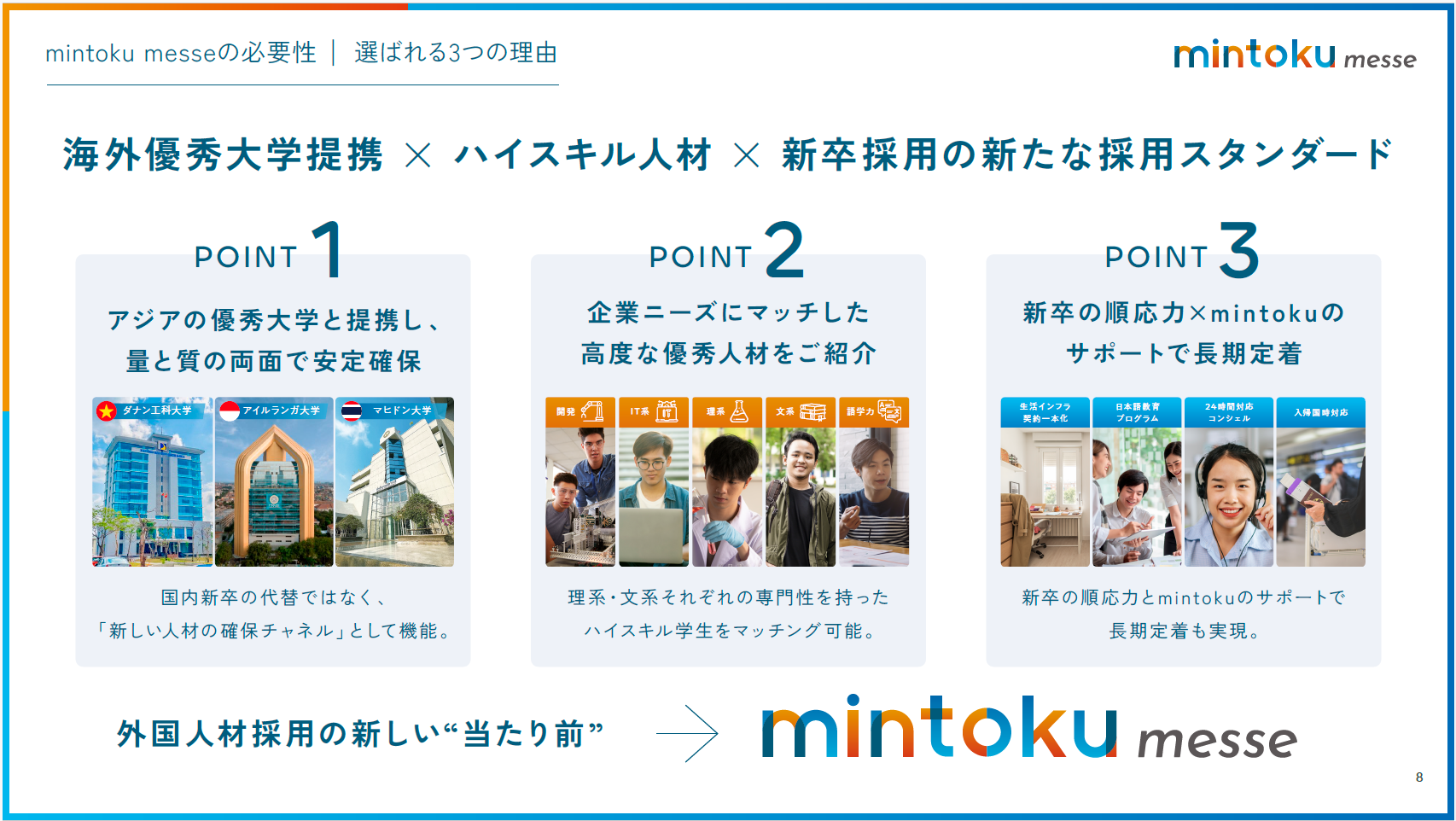キャムグローバルは現在、アジアを中心とした50校以上の大学と提携しており、その数はさらに増えつつあります。『mintoku messe』では、リアルとオンラインの両チャネルを通じて、ハイスキルな新卒外国人材と日本企業のマッチングの実現をめざします。