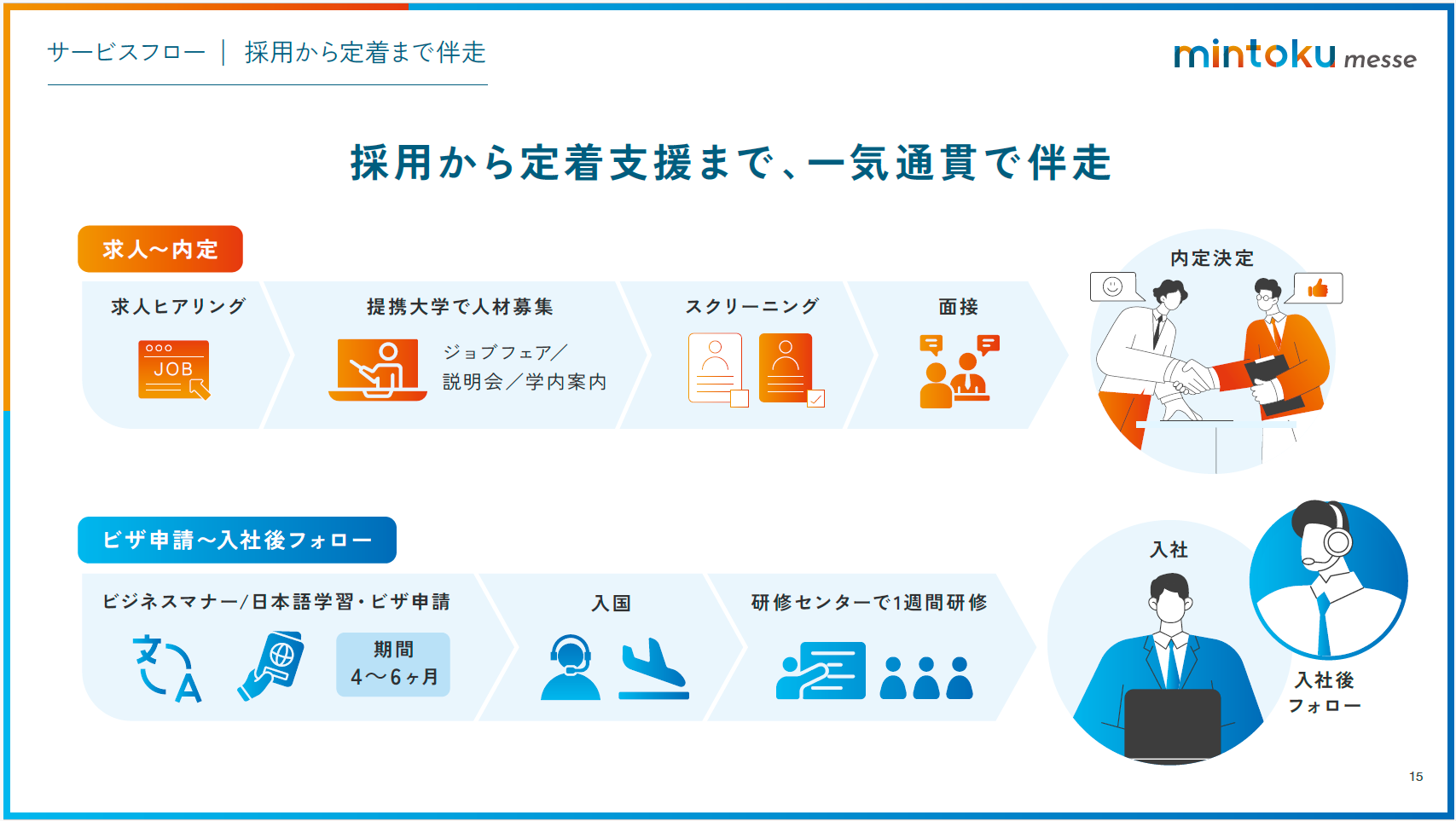 これは、キャムグローバルが展開する外国人雇用の包括援サービス『mintoku(ミントク)』事業の一環です。各大学のジョブフェアやキャムグローバルが運営する専用求人サイトなどを通じて、技人国(技術・人文知識・国際業務)の在留資格の取得をめざす人材を確保し、日本企業のニーズに応じて採用から入社後の定着支援まで一気通貫で支援します。