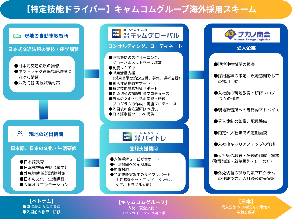 【特定技能ドライバー】キャムコムグループ海外採用・育成・定着支援スキーム